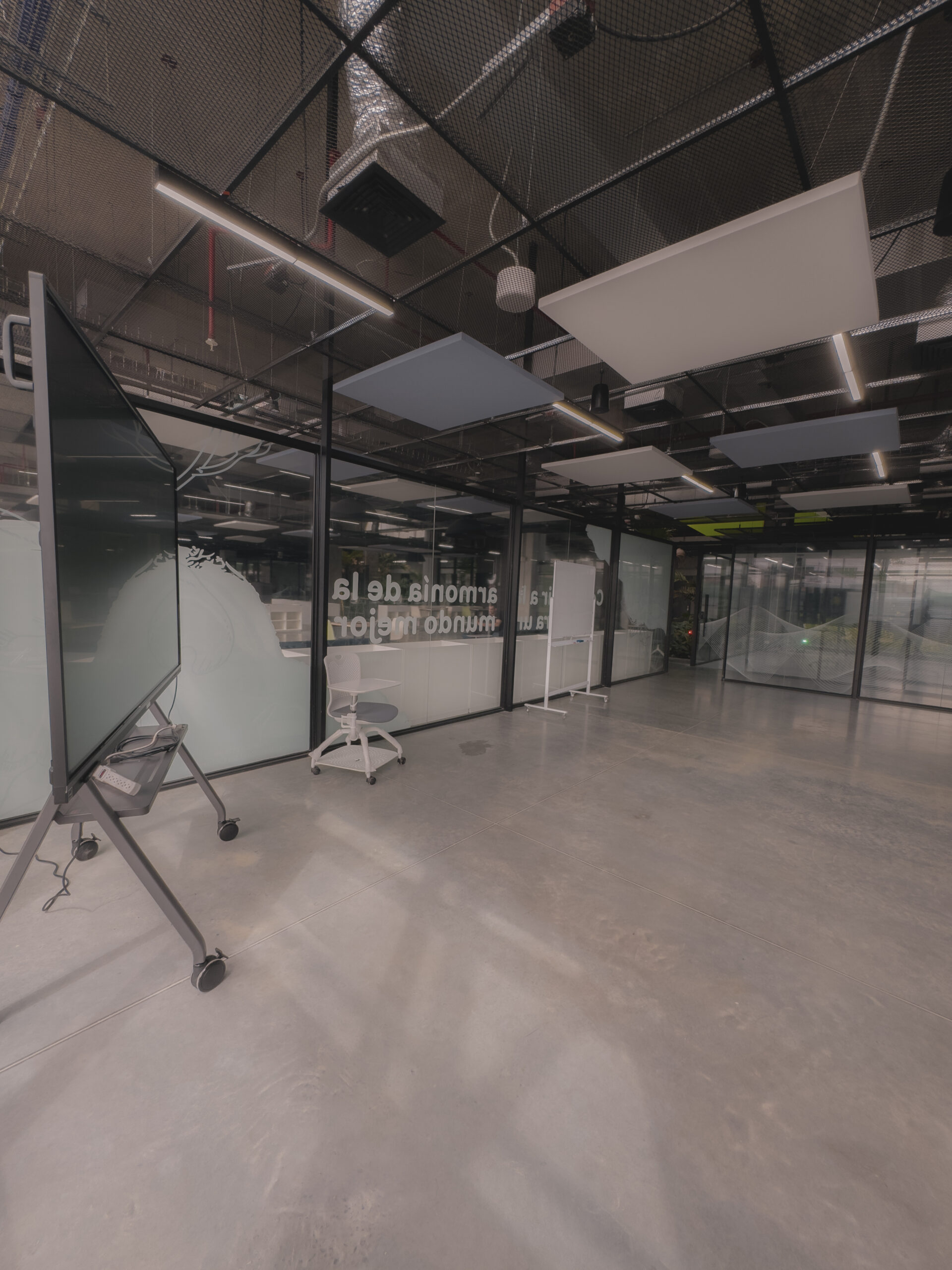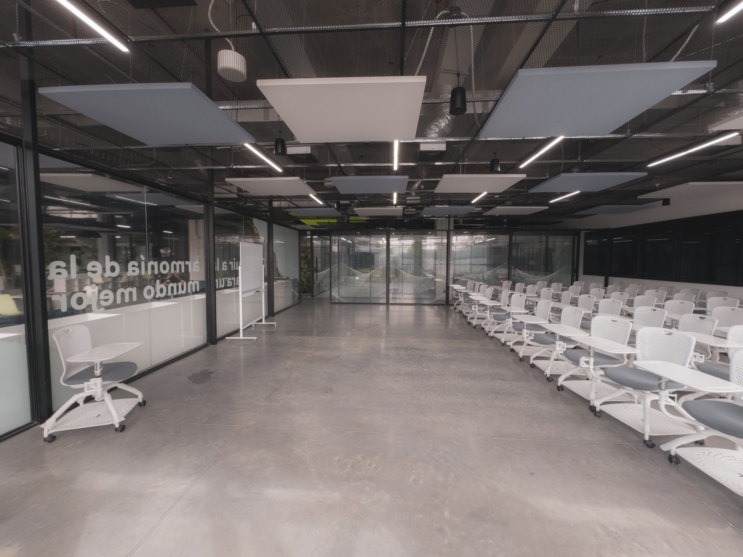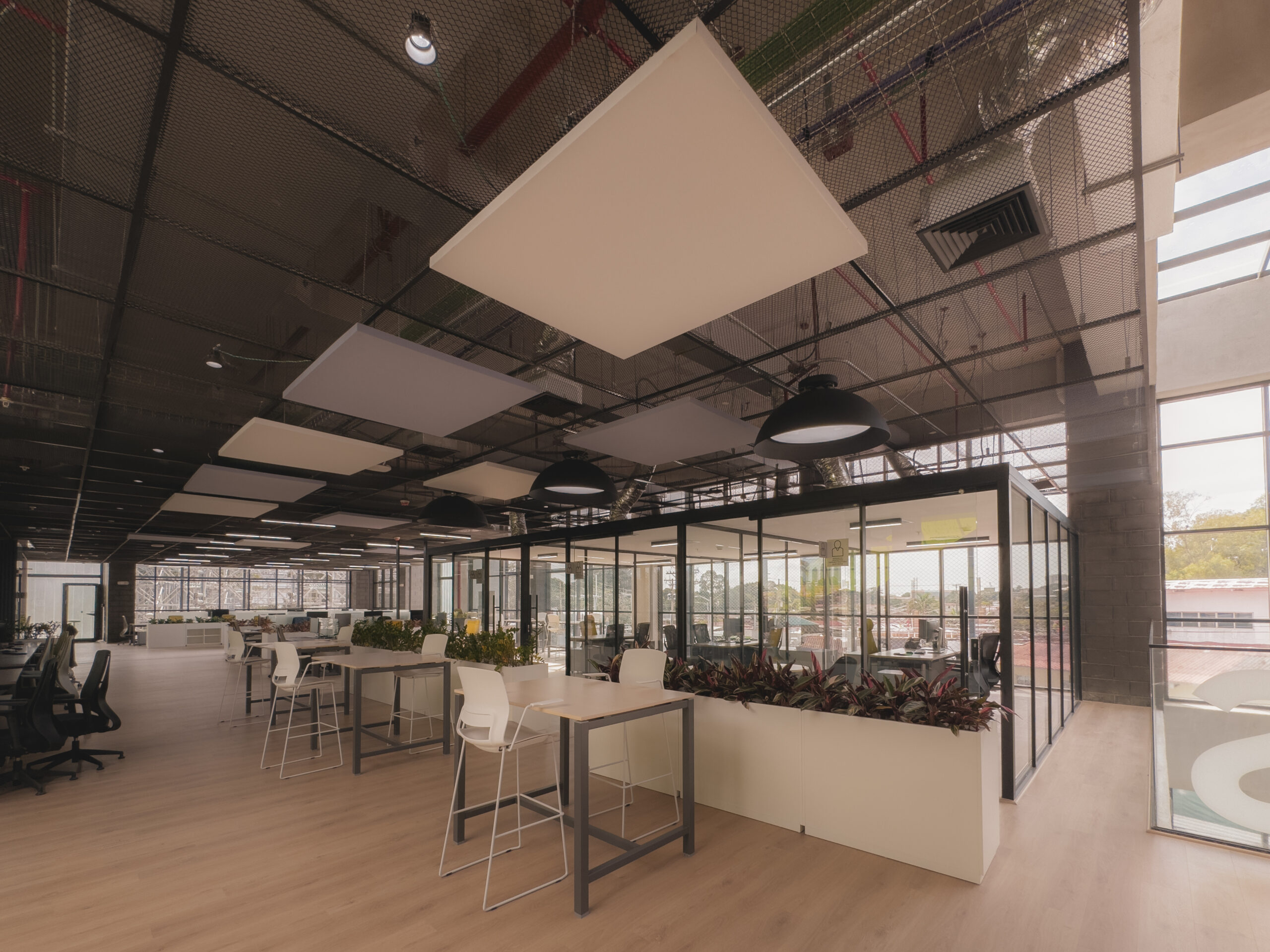 Dentro de este ambicioso proyecto, Duo Design S.A. tuvo a su cargo la implementación de soluciones acústicas a medida, orientadas a mejorar el confort sonoro en espacios críticos y operativos. Se instalaron nubes acústicas suspendidas y elementos fonoabsorbentes de alto desempeño, desarrollados con materiales sostenibles y fabricados bajo estándares internacionales de absorción acústica.