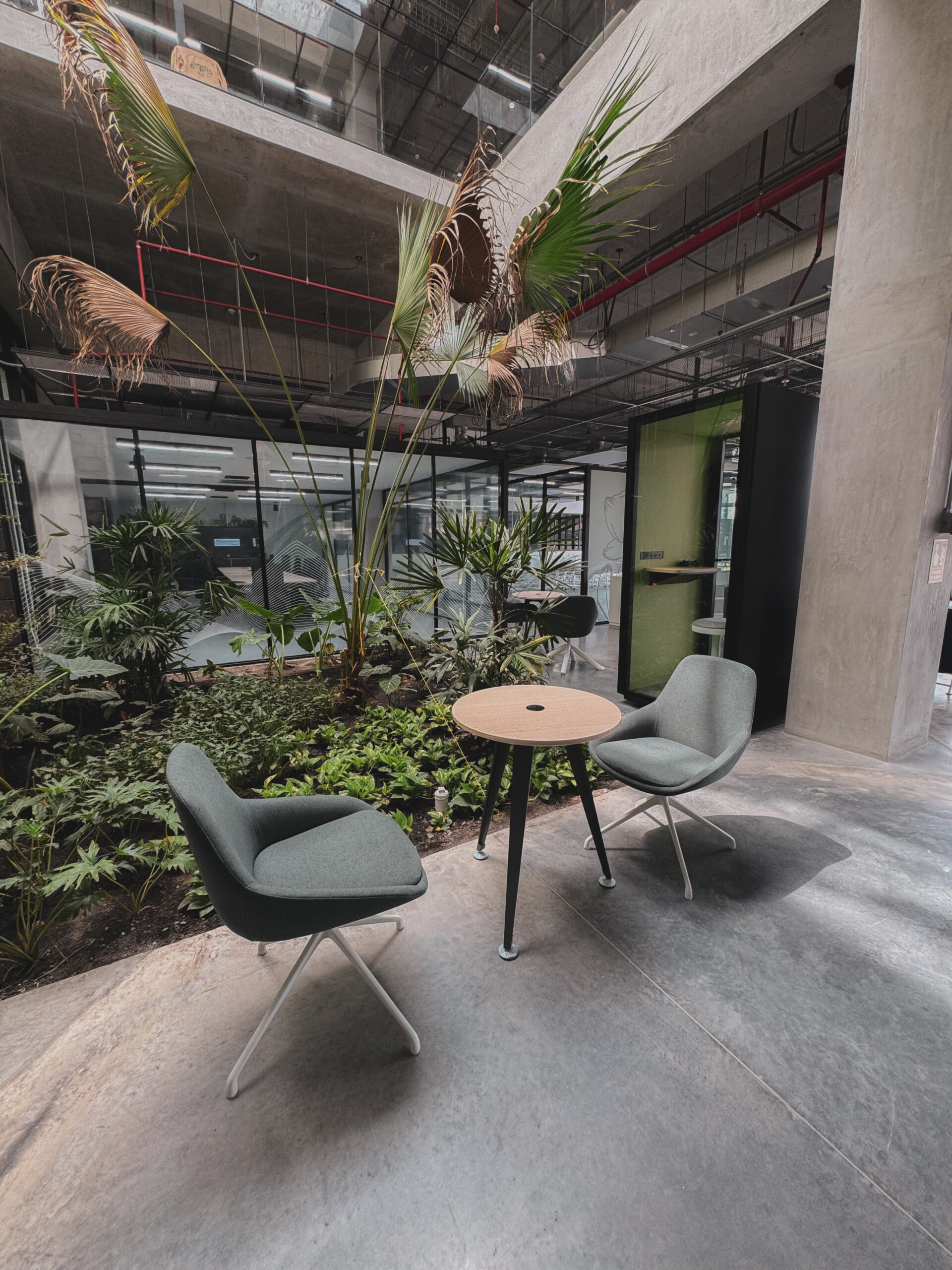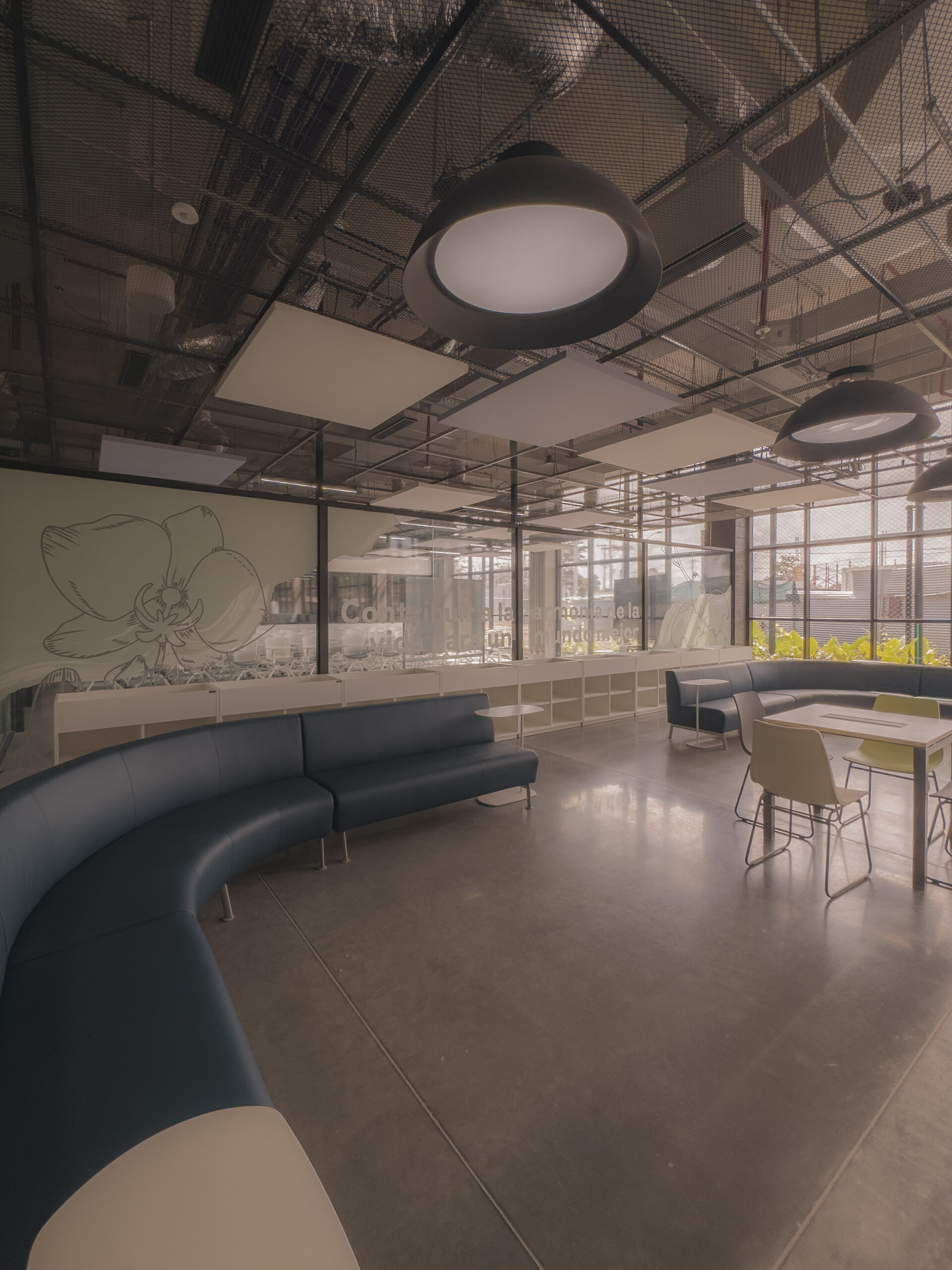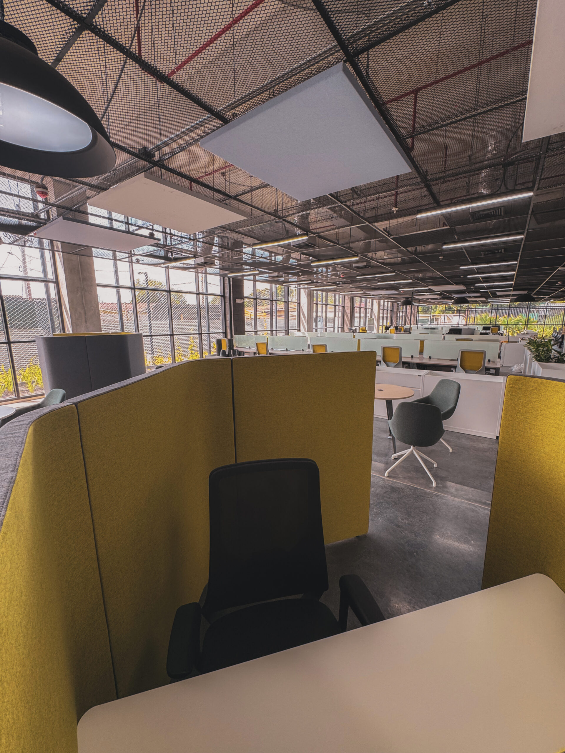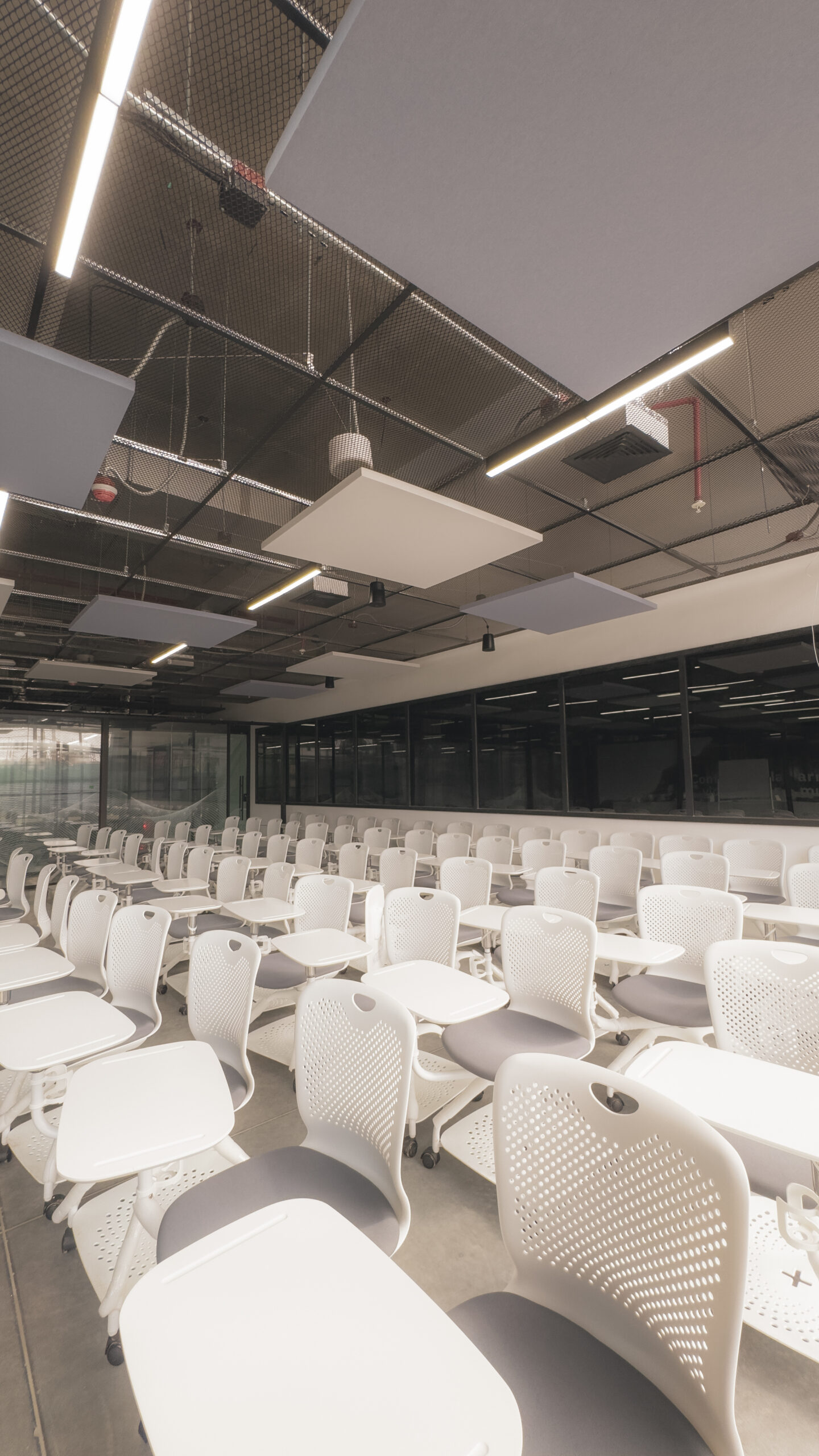 Dentro de este ambicioso proyecto, Duo Design S.A. tuvo a su cargo la implementación de soluciones acústicas a medida, orientadas a mejorar el confort sonoro en espacios críticos y operativos. Se instalaron nubes acústicas suspendidas y elementos fonoabsorbentes de alto desempeño, desarrollados con materiales sostenibles y fabricados bajo estándares internacionales de absorción acústica.